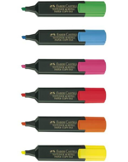 Brighter marking with super fluorescent ink Chisel tip for 3 line widths Refillable with faber-castell textliner ink Use for paper,copy, fax Longer writing length Special non-porous polypropylene body for longer shelf life Classic textliner available in 5 super fluorescent colours: yellow, pink, green, orange & blue